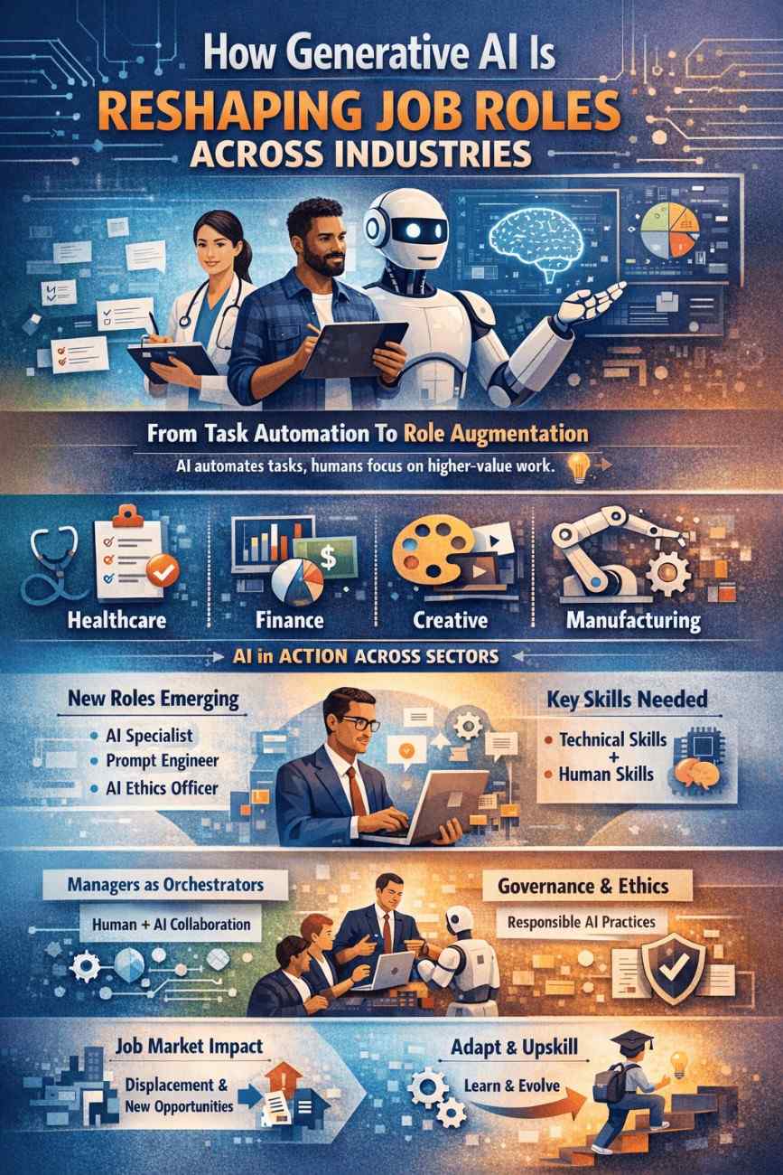 Generative AI — systems that can create text, images, code, designs, and even strategy-level suggestions — has moved from novelty to everyday tool in record time. What began as research prototypes and demos now sits on many employees’ desktops and phones, quietly changing what work gets done, who does it, and how organizations design roles. The result isn’t a single outcome (mass layoffs or utopia) but a complex reshaping of tasks, skill mixes, career paths, and workplace expectations.